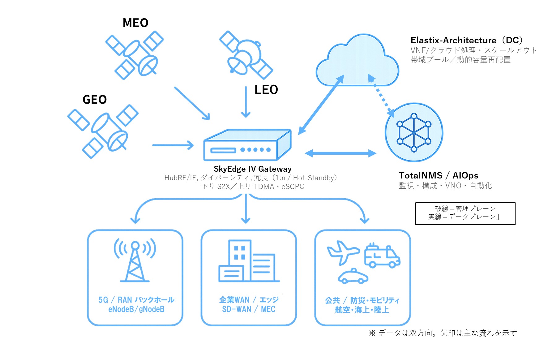 次世代のマルチオービット対応VSATプラットフォーム。 GEO/NGSOと地上を横断し、ユースケースごとに最適な回線/方式を選択して提供します。